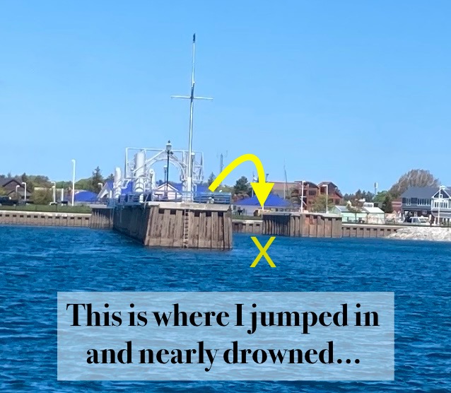 That wake came into the channel where I was floundering and began to churn like a washing machine. It pushed me toward the pier where I hung on with hands and feet, getting cut to ribbons by rust and barnacles.